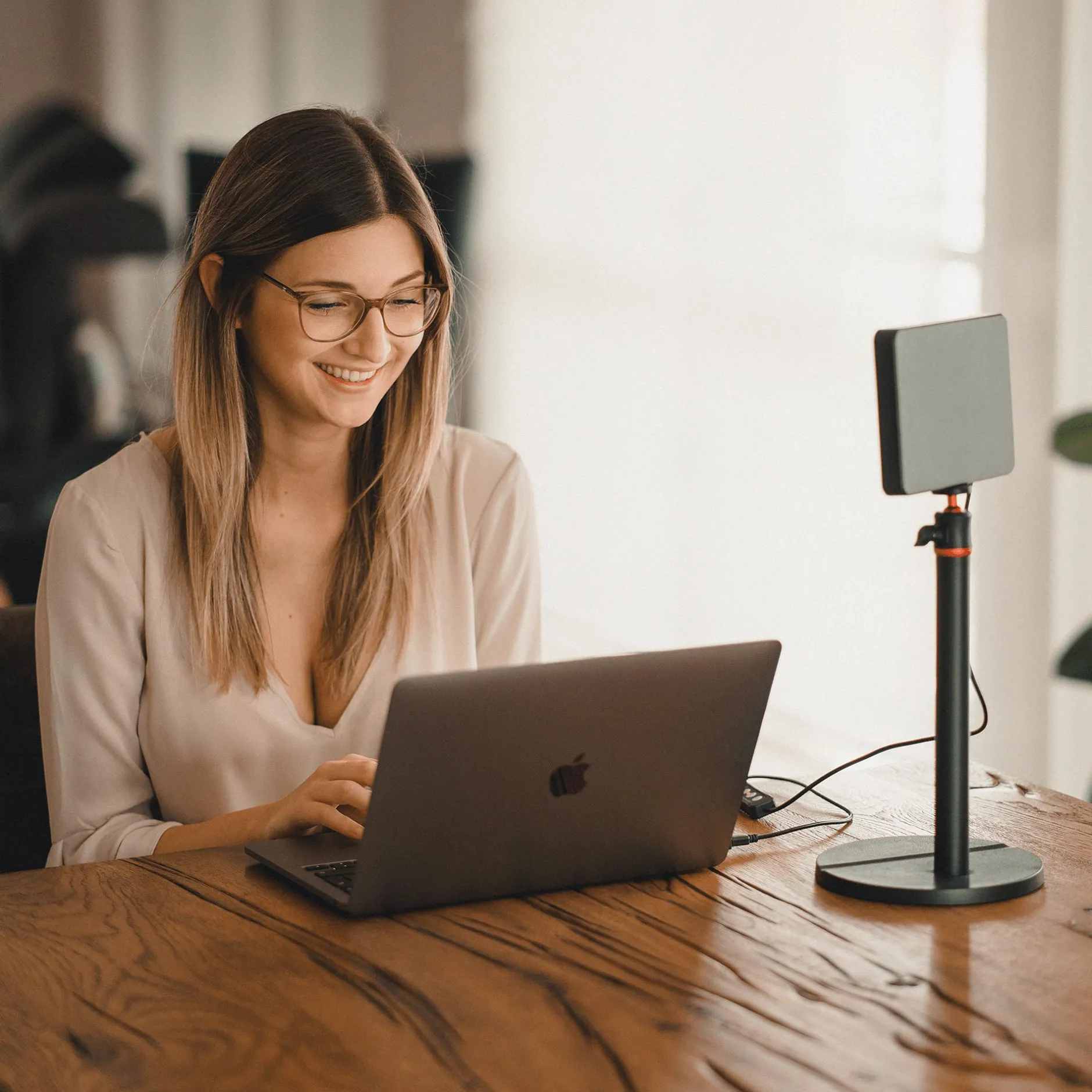 Unser LUMIS Key Light ist die ideale Ergänzung für Ihren Schreibtisch. Es eignet sich hervorragend zur professionellen Ausleuchtung von Videokonferenzen, zum Vlogging oder für Streams. Denn auch bei Dauereinsätzen blendet das LUMIS Key Light Sie nicht. Das liegt an den speziell verbauten LEDs, die nicht mittig, wie sonst bei Studiobeleuchtung üblich, sondern am Rand im Rahmen des LUMIS Key Light sitzen. Durch den eingebauten Diffusor erzeugt es so ein indirektes Licht, ohne zu blenden.